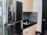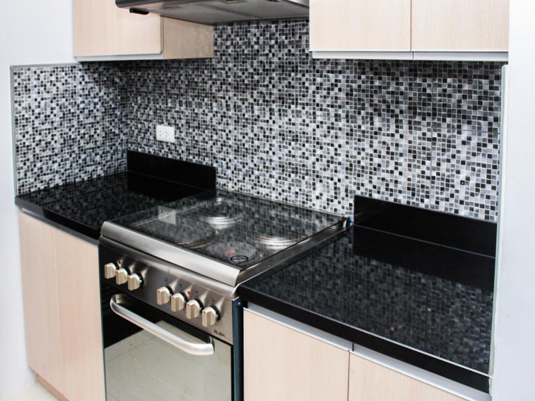 - To the right of the main door is the open kitchen with black granite counter-tops and mosaic back splash tiles. Ginger-colored cabinets provide multiple storage