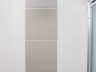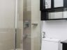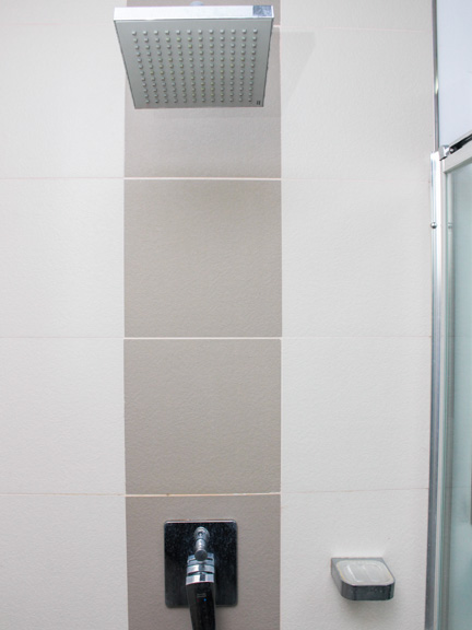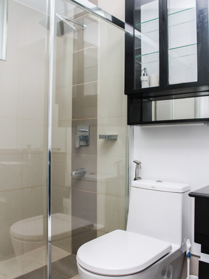 - The bathroom is fitted with a fixed rainfall shower visible through the clear glass shower enclosure. Above the flush tank a medicine-bathroom cabinet in brown wooden frame a and glass shelves is mounted