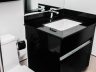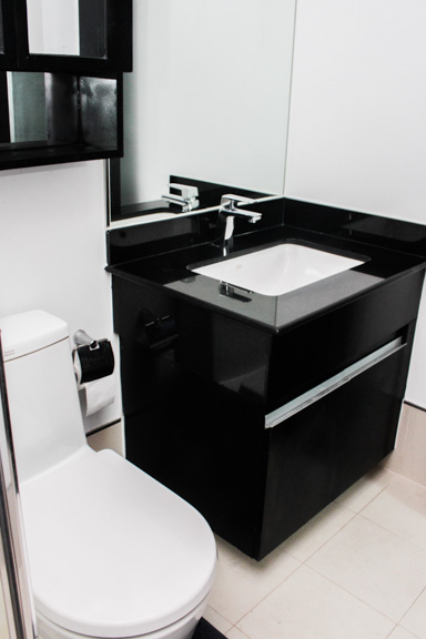 - An under-mount sink is in a black granite bathroom counter-cabinet. On the wall above it is a big mirror
