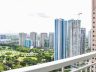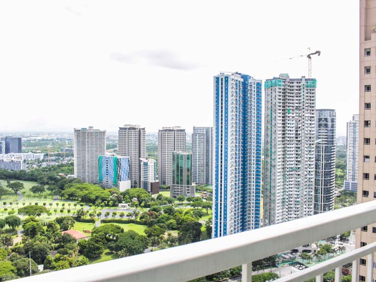 - From the balcony is the view of the lush green grounds and trees and the distant city skyline