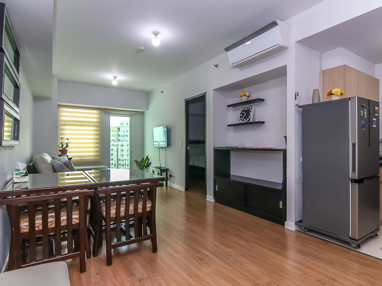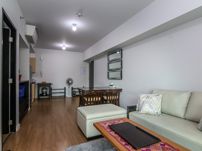 - Across the kitchen against the wall is the four-sitter wooden dining set in a continuous layout with the living room