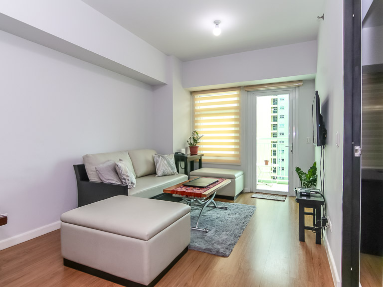 - Natural light enters the living room through the custom windows with zebra blinds, and the glass balcony door