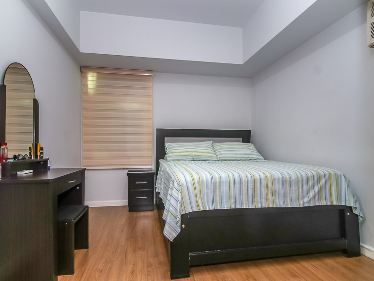 - The cozy bedroom features dark brown wooden furniture namely the queen-sized bed with a headboard, a bedside table with two drawers, and a table dresser with a stool