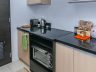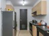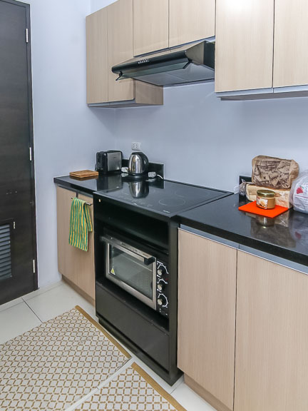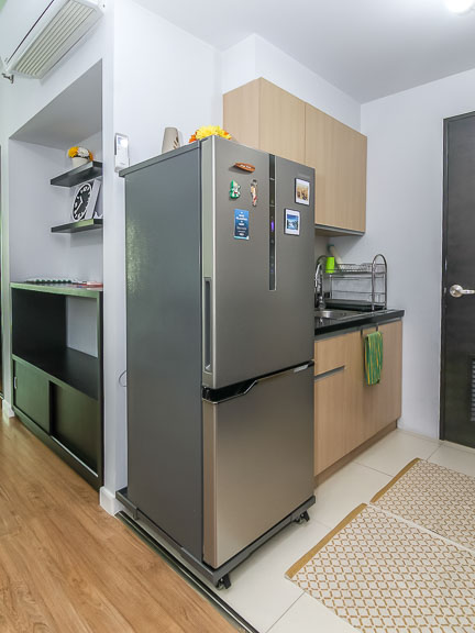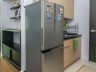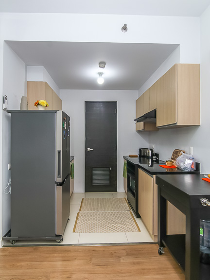 - The main door opens to an open corner kitchen in a two-walled layout and non-slip floor tiles, with black granite counter-tops and latte-colored storage cabinets. Appliances include a two-door refrigerator and an induction range with hood