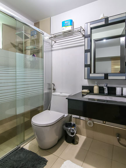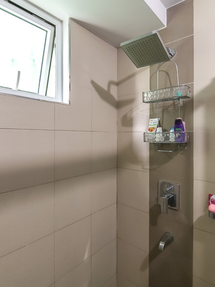 - The bathroom is generously-spaced, with an added window ventilation. Fitting include a fixed rainfall shower, toiletries rack, a shower enclosure