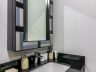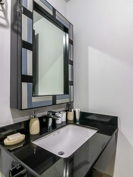 - The black granite vanity counter sits an under-mount sink and on the wall above it is a framed mirror