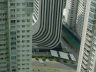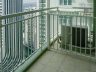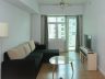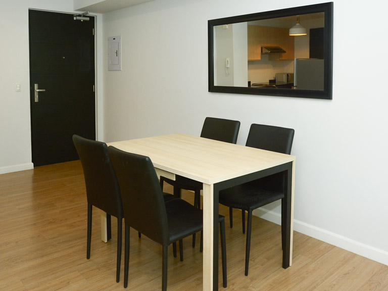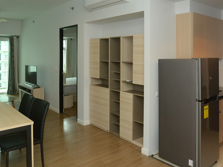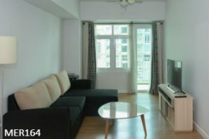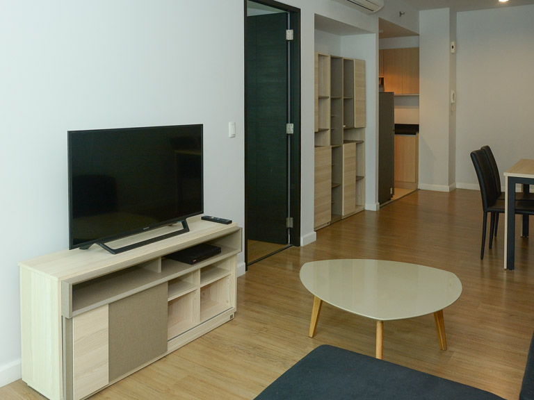 - Living area has a dark gray sectional couch, flesh cushions, modern wood center table, and flat-screen TV