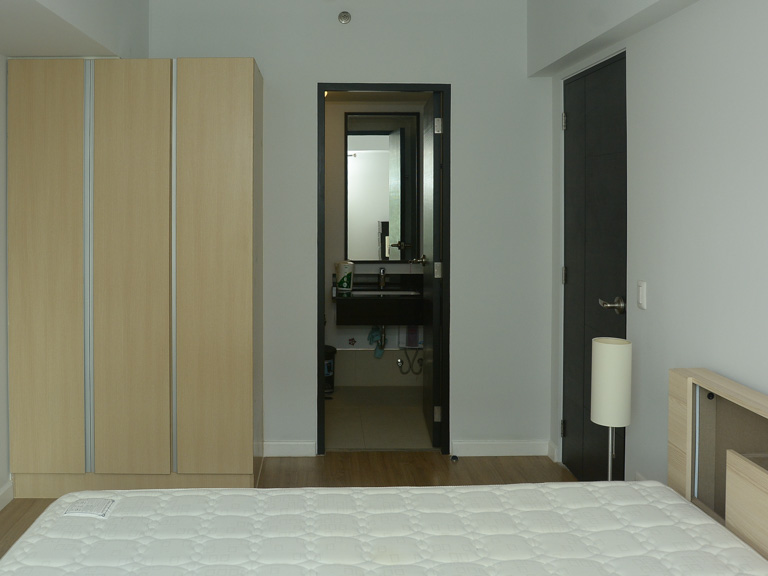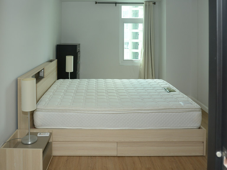- Queen size storage bed, side tables with shaded lamps, chest of drawers and cabinet in the bedroom