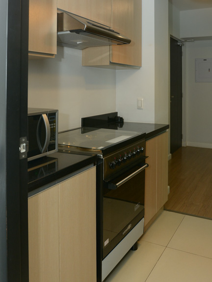 - Two-wall kitchen equipped with two-door ref, electric range with hood, and microwave