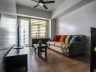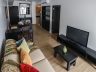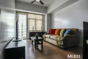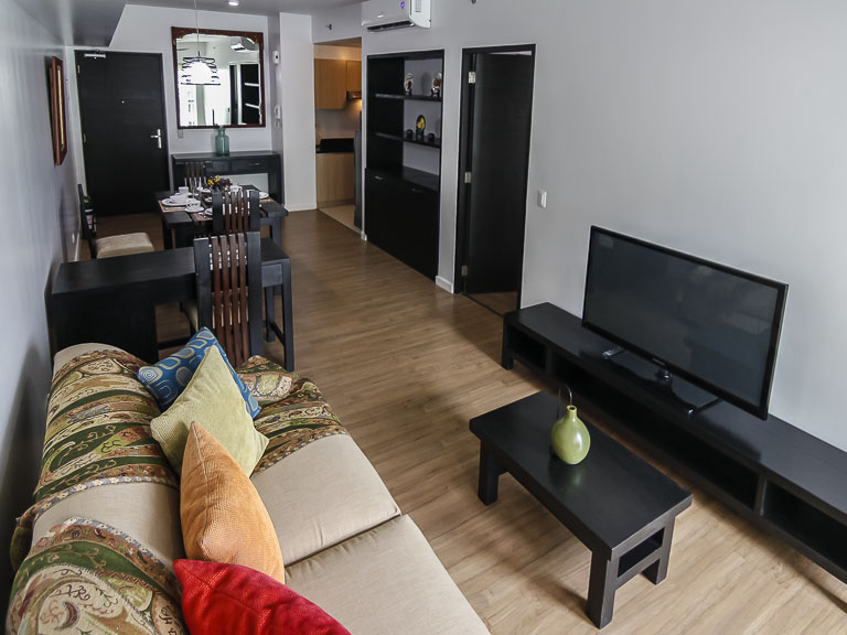 Living room provided with a large comfortable sofa with lovely throw pillows, table, TV placed on a cabinet