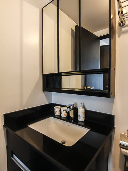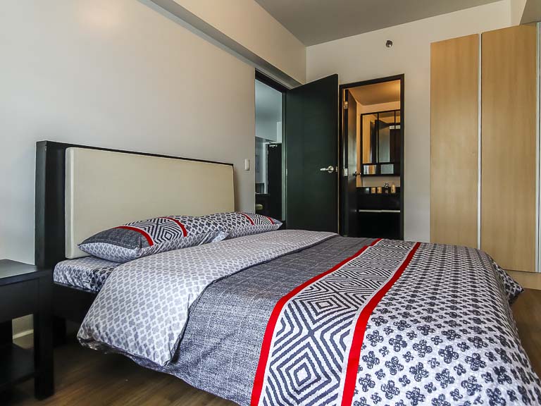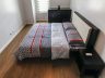 Bedroom with a headboard platform bed, cabinet and pristine sheets