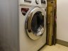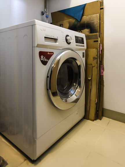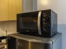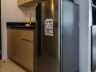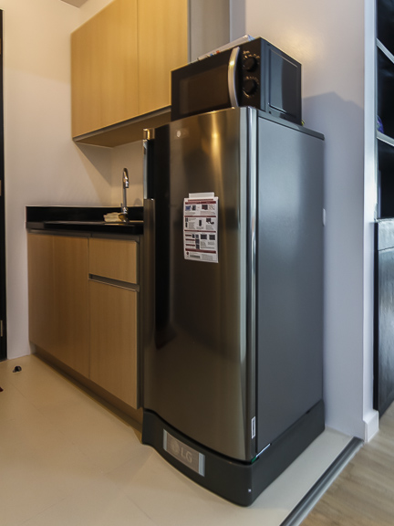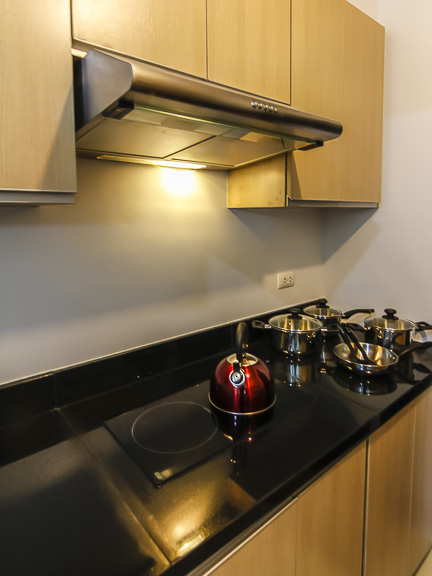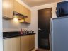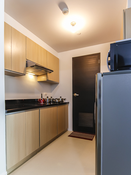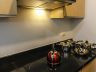 Kitchen with a refrigerator, microwave, all sorts of cutleries, cooker and a rangehood
