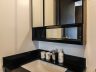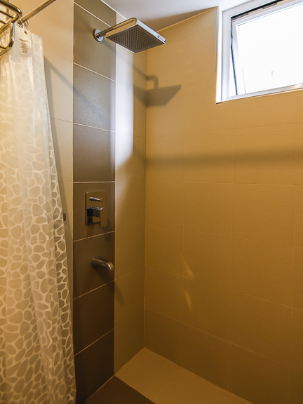 Shower room with a rainfall shower head and a toilet with a spotless bright mirror and a shelf to keep toiletries