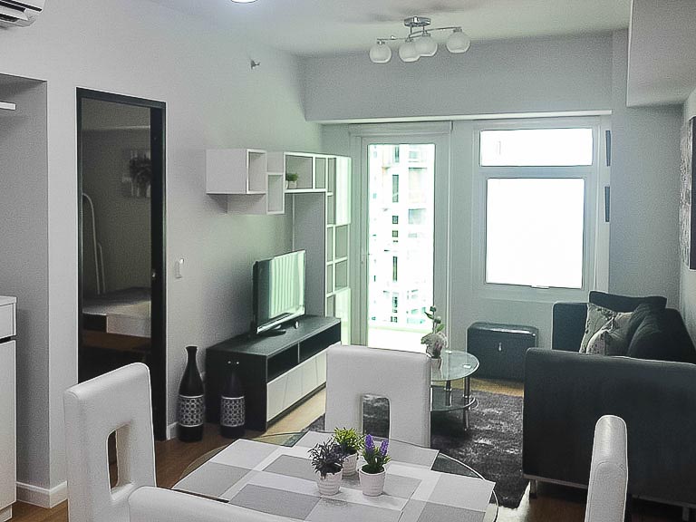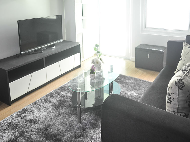 • Living room with a replete sofa, glass table, TV placed on a tv cabinet and a cozy rug