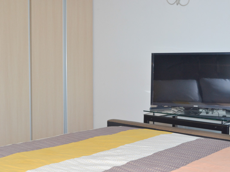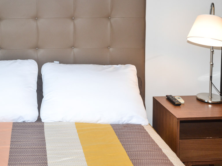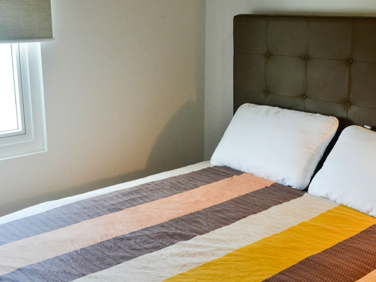 • Full twin bed with upholstered headboard, wall-mounted flat-screen TV in bedroom; pillows, linens and comforter provided