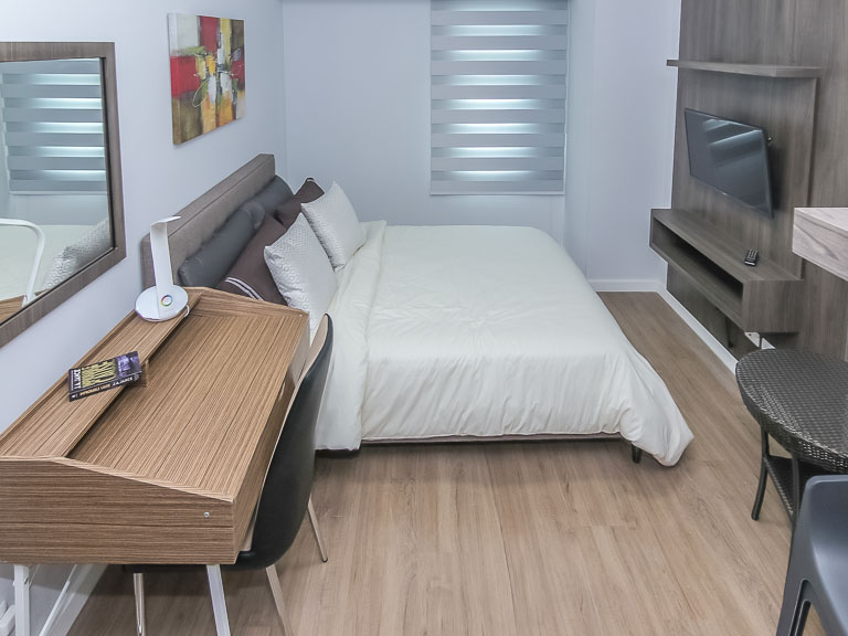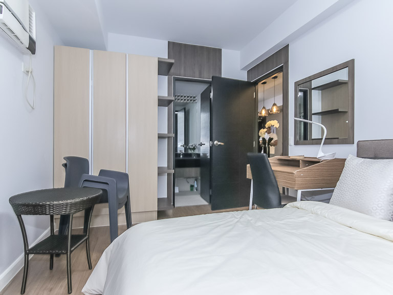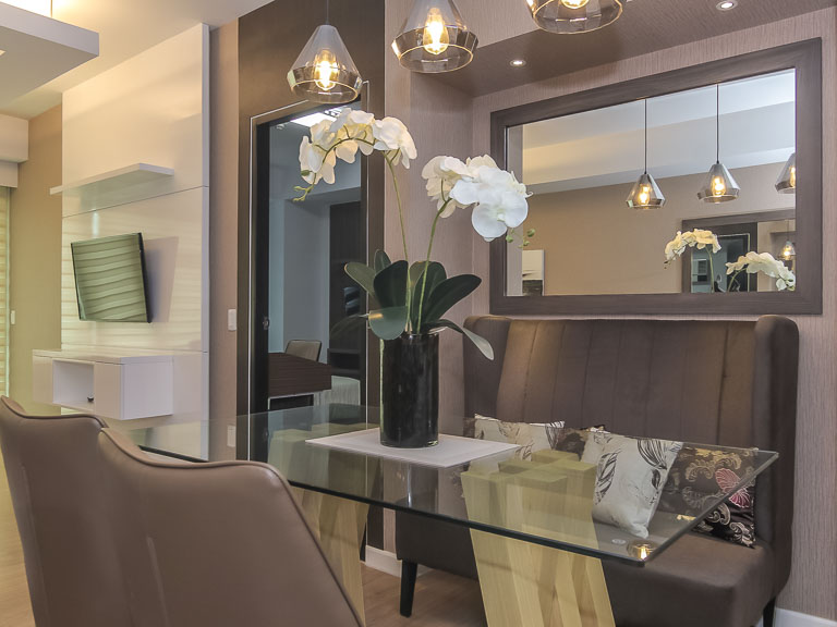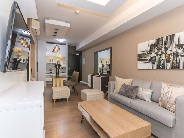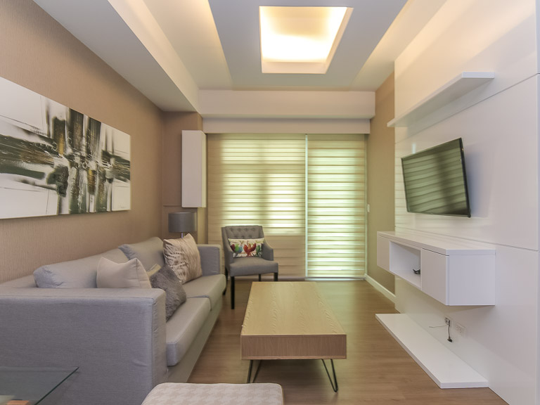 • This exquisite one bedroom apartment located in the Serendra-2-Meranti building has quality furniture, warm interior lighting, polished parquet flooring, a well equipped kitchen and lovely wall art