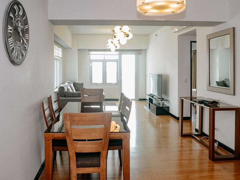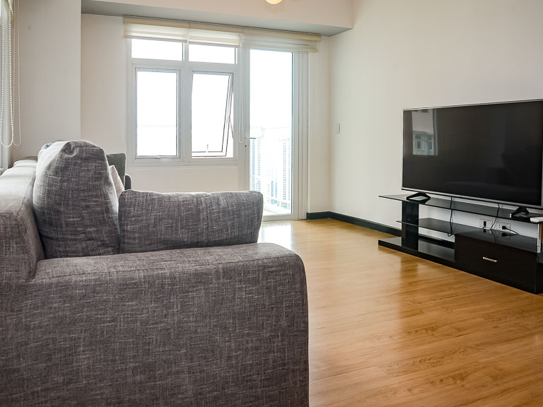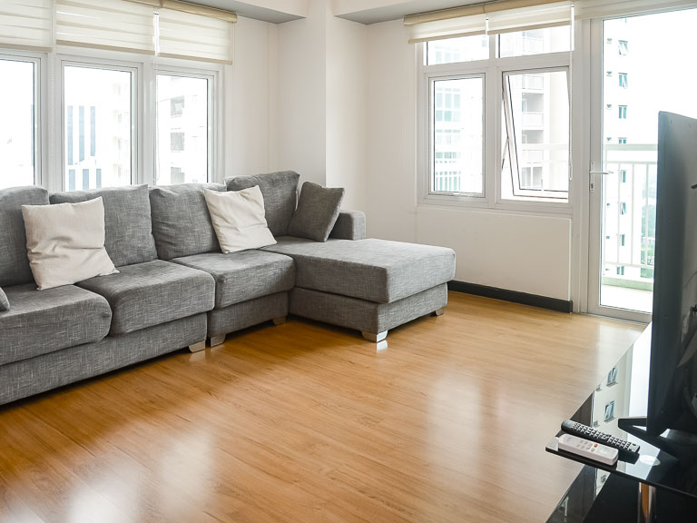 - Good quality daylight enhances the living room through the custom windows and glass balcony door