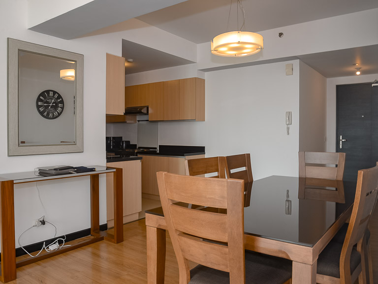 - Across the dining table is a narrow glass top console table and mounted on the wall above it is a framed mirror