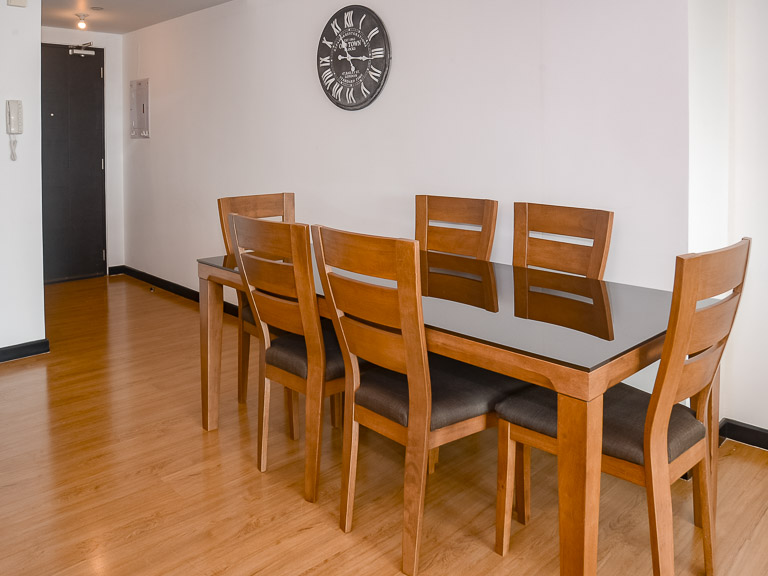 - The dining table set is a six-sitter rectangular wooden table with upholstered seats