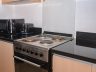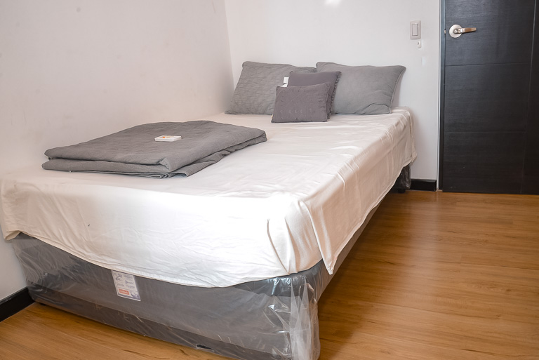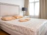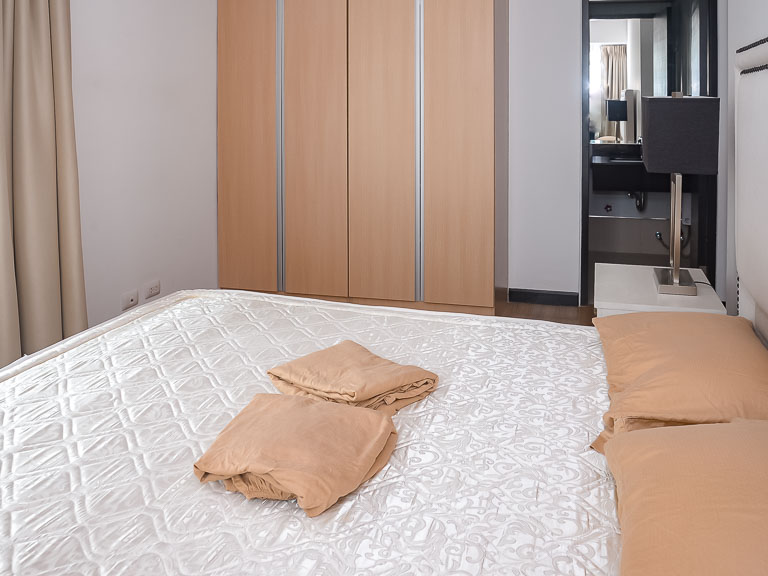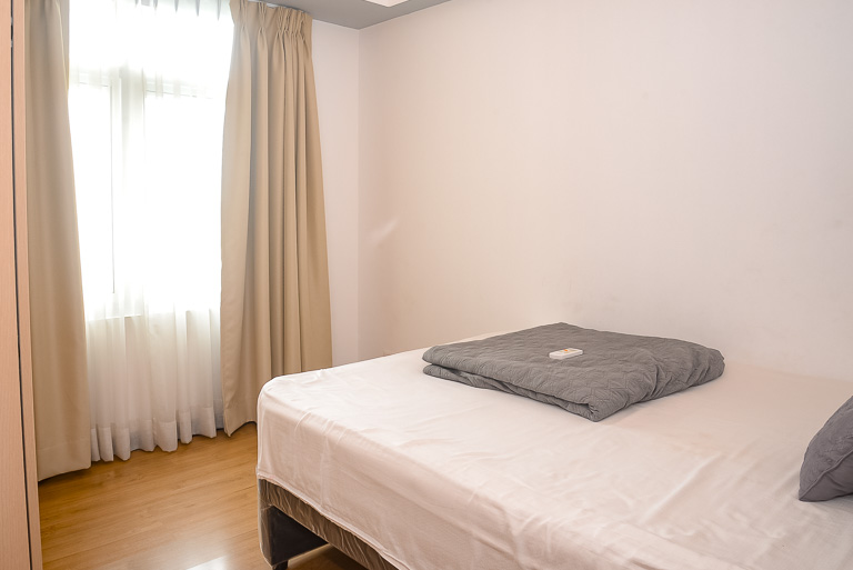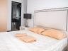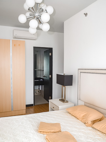 - Bedroom 1 is large, with an upholstered queen-sized bed with a headboard, bedside drawers with table lamps, and a two-panel vinyl-coated wardrobe cabinet