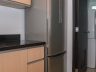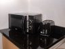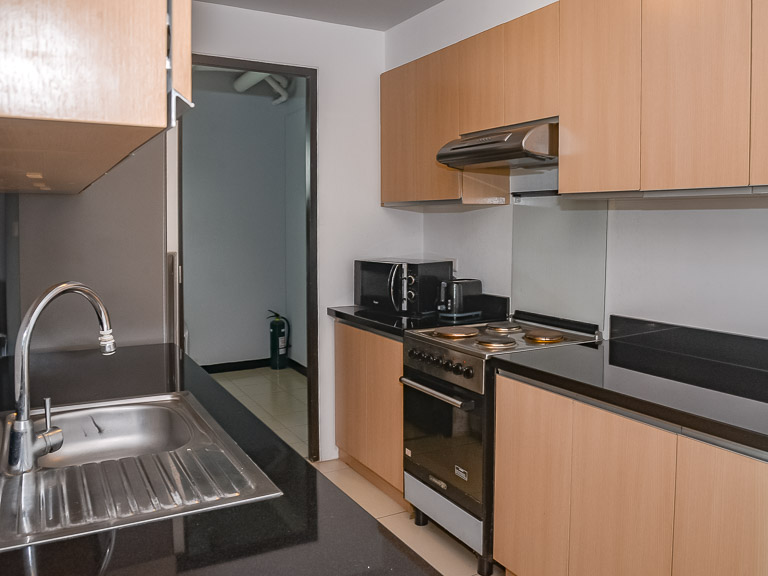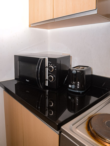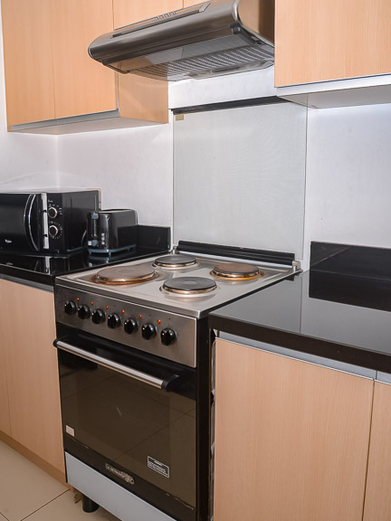 - Kitchen essentials include a single sink with drain-board, a four-burner electric range with hood, microwave and a double-door refrigerator