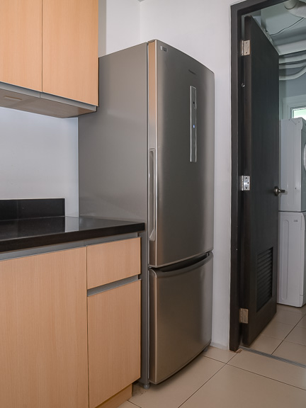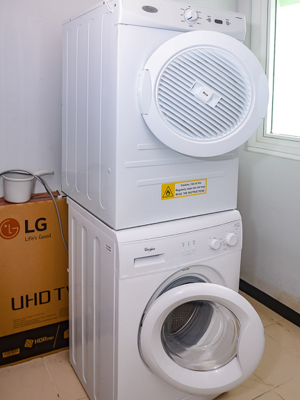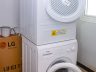 - Through the kitchen, a louvered door opens to the laundry area with a stack-up washing machine and dryer