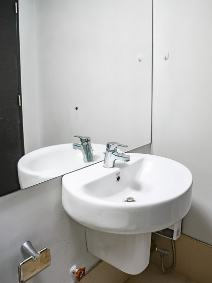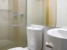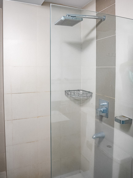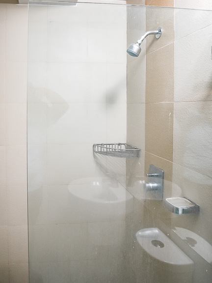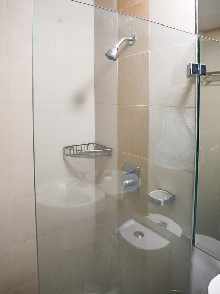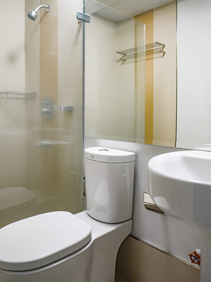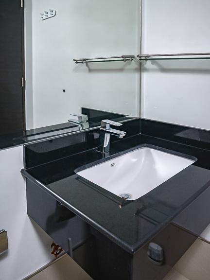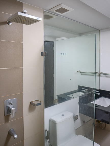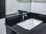 - The two bathrooms are similarly structured, each fitted with a fixed shower head, and with shower enclosures. Bathroom 1 has a wall-mounted sink, bathroom 2 has a vessel sink on a black granite bathroom counter