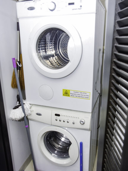 • Utility closet near the entrance houses stacked front-load washer and dryer