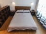 - Bedroom close to the glass panel wall, with a queen-sized wooden platform bed with a headboard, wall-mounted night lights, and bedside table