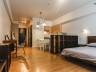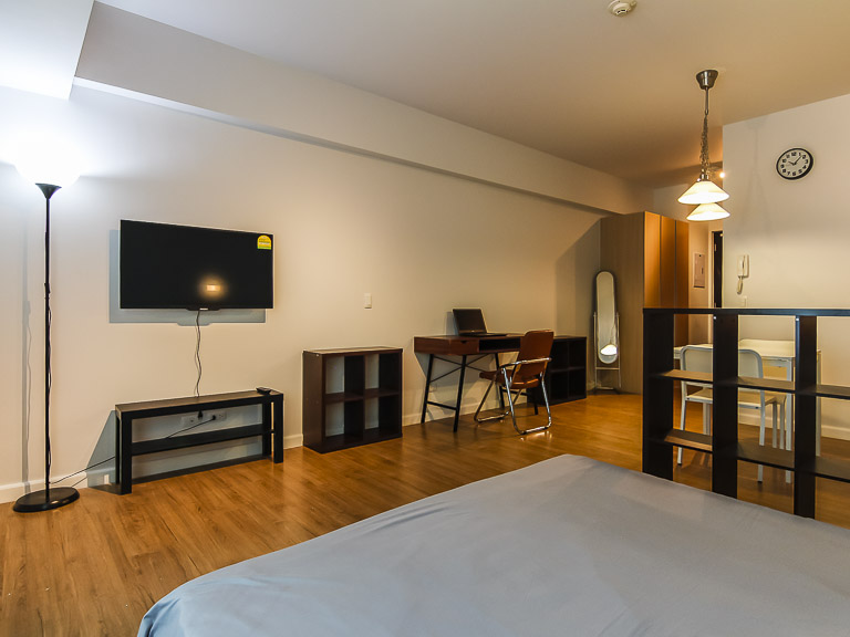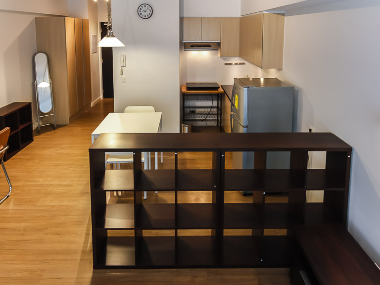 - A chocolate-brown wall rack divider with equally-sized see-through shelves separates the “bedroom’ from the rest of the unit’s sections