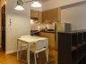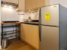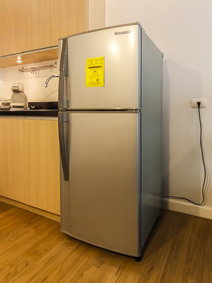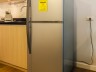 - The dining table set just across the ref is a two-sitter cream-colored wooden square table with matching chairs