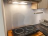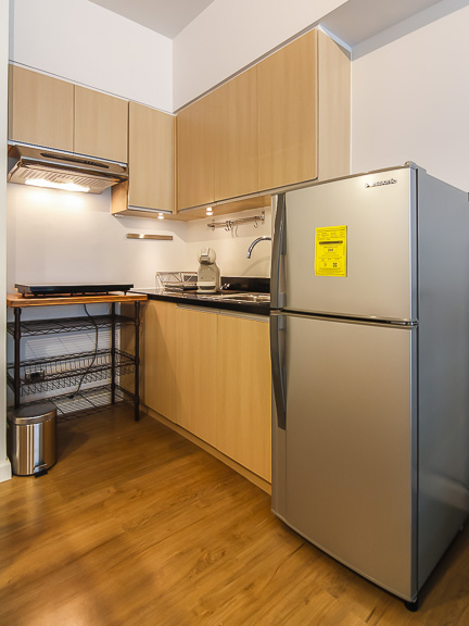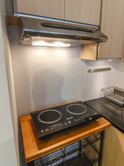- Appliances include a two-burner induction countertop with hood and the two-door refrigerator