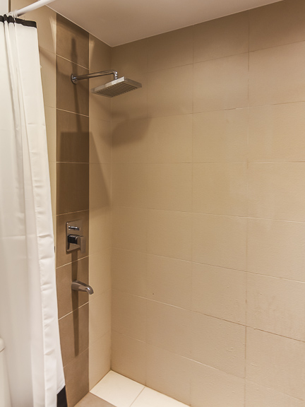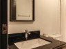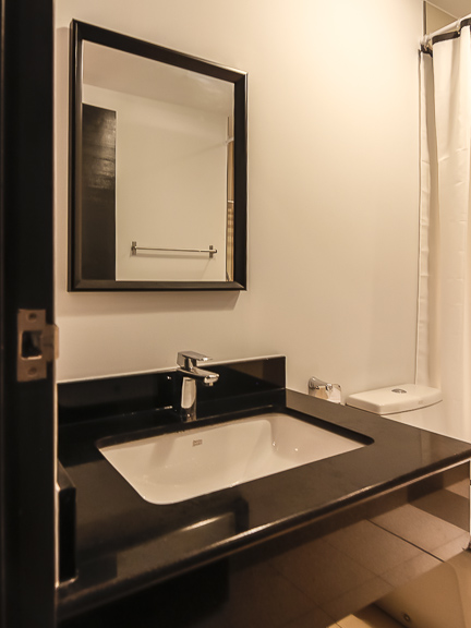 - Bathroom with a black granite counter, under-mount sink, a fixed rainfall shower, and a shower curtain enclosure