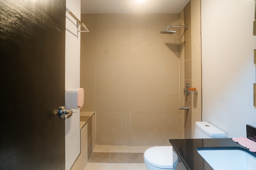 • Spacious bathroom has a handheld shower installed