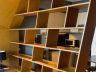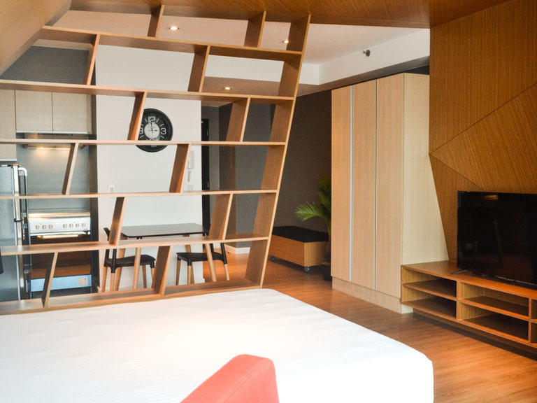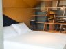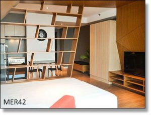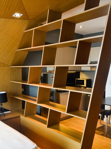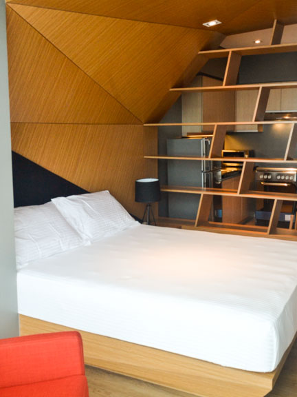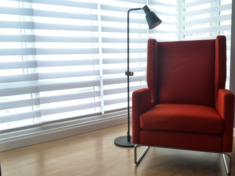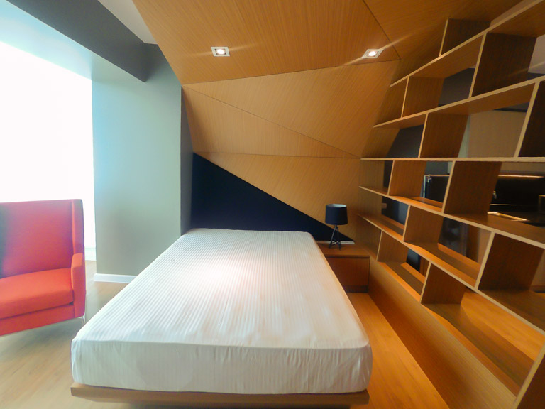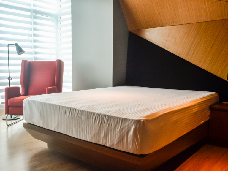 • Full twin mattress on a zen style platform bed frame, next to a comfy red reading chair