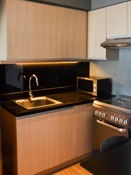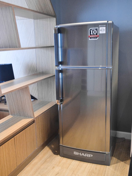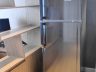 • Corner kitchen, two-door fridge, electric range with hood, and microwave oven