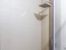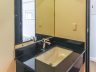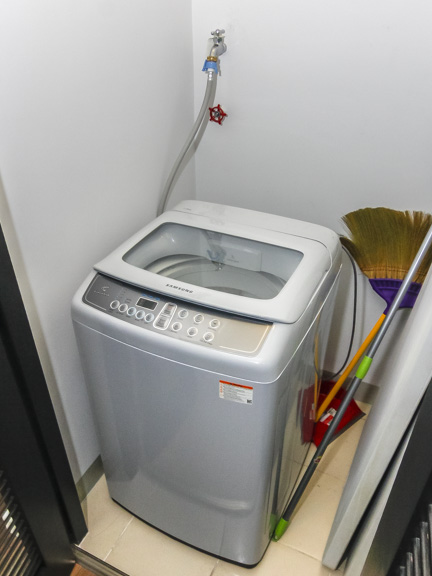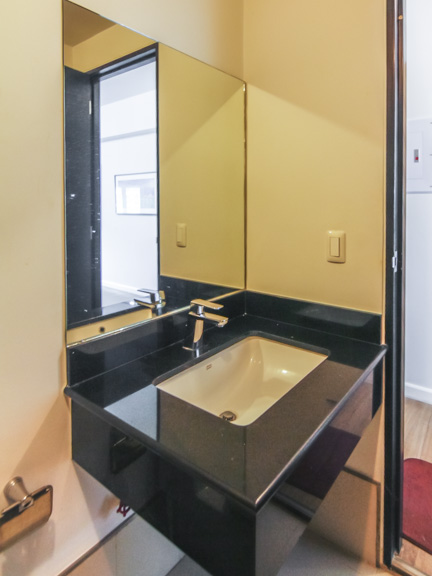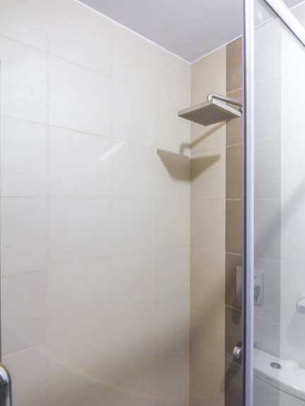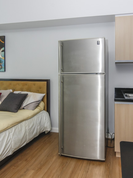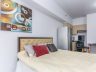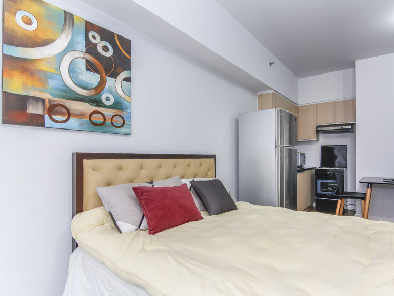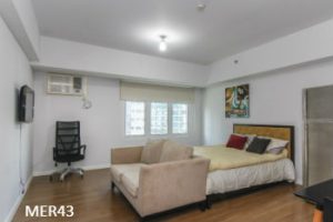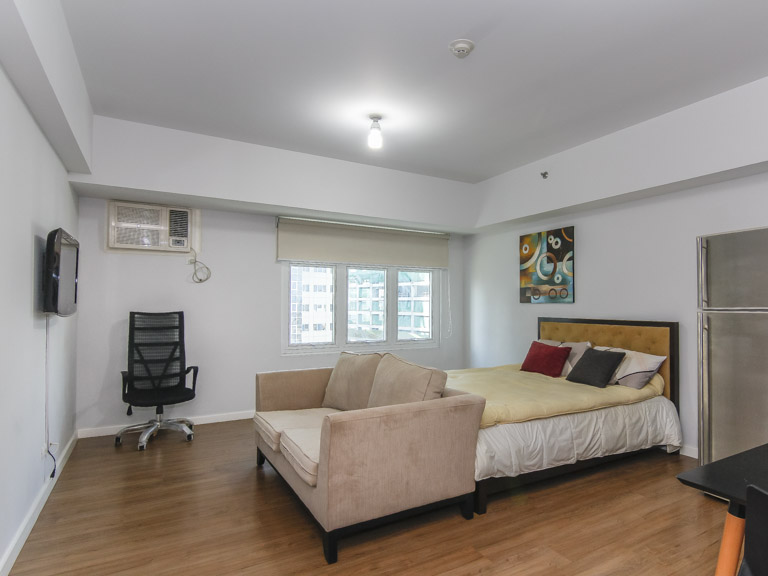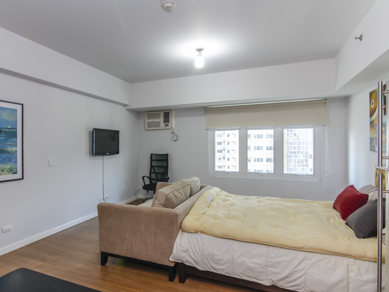 This large Studio apartment is found in the Meranti-Serendra2 building. It contains an upholstered double bed, a two seater couch, a mounted black television set, an electric air conditioner, polished paquette floors and wide windows