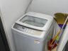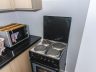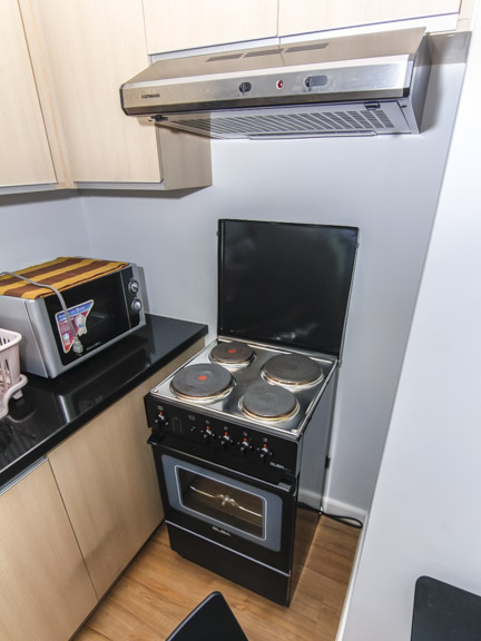 The kitchen contains a refrigerator, a four burner electric stove with a kitchen exhaust right above it, a microwave oven and easy to clean paquette floors