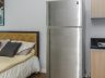 The living area which doubles as a bedroom contains an upholstered double bed, a two seater couch, a mounted black television set, wide windows and electric air conditioner