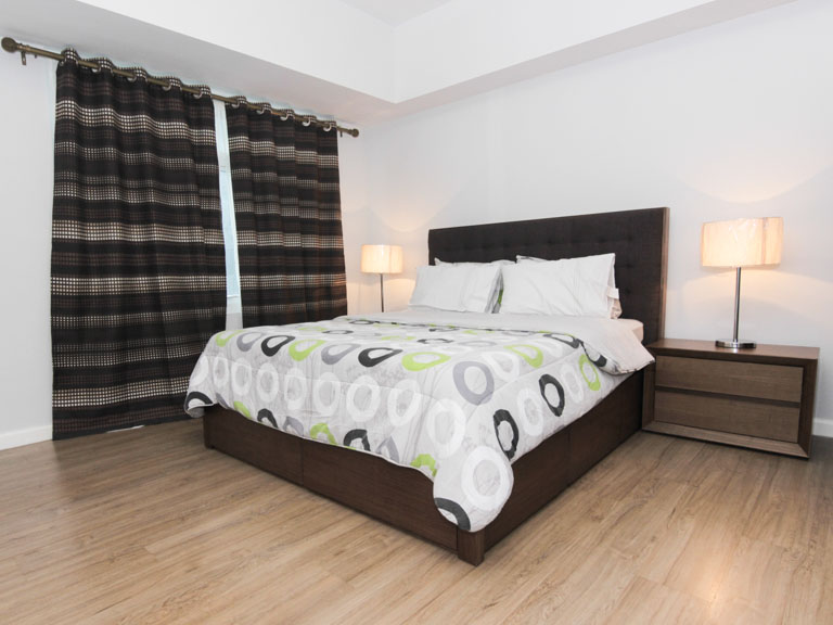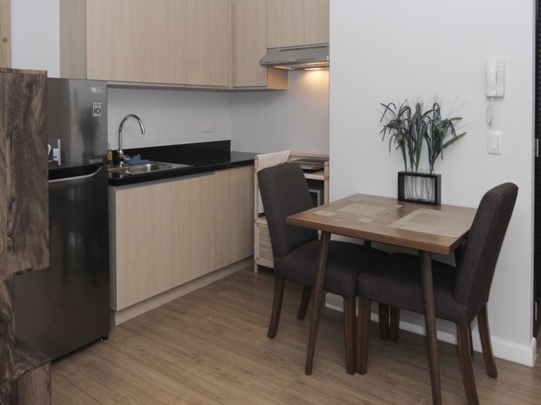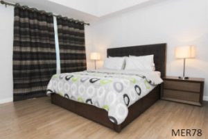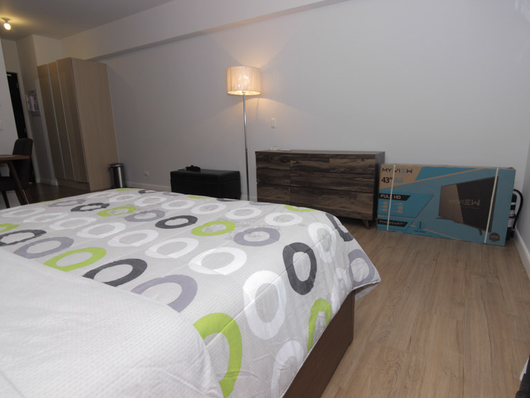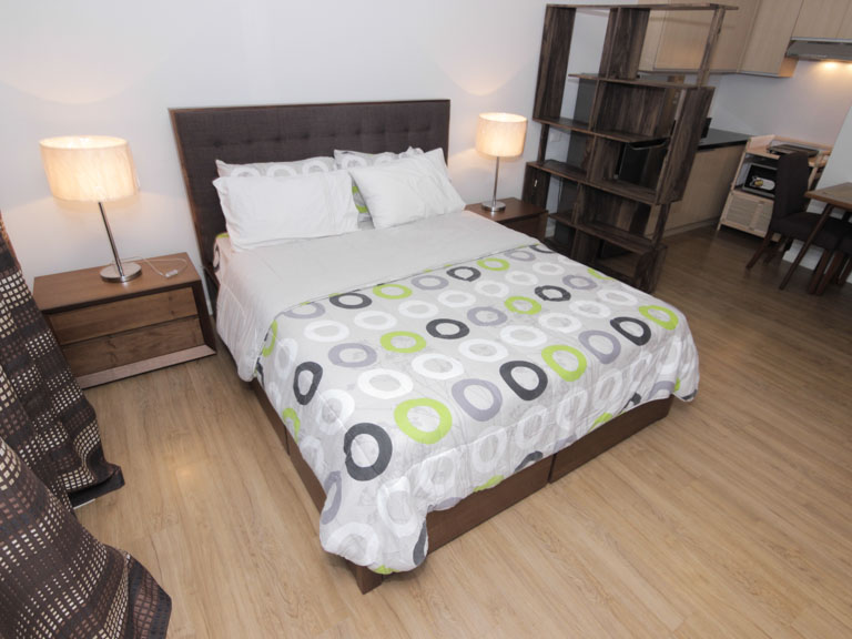 - Wooden modern floor and a cabinet placed between the kitchen and the bed