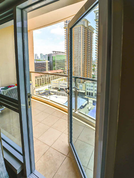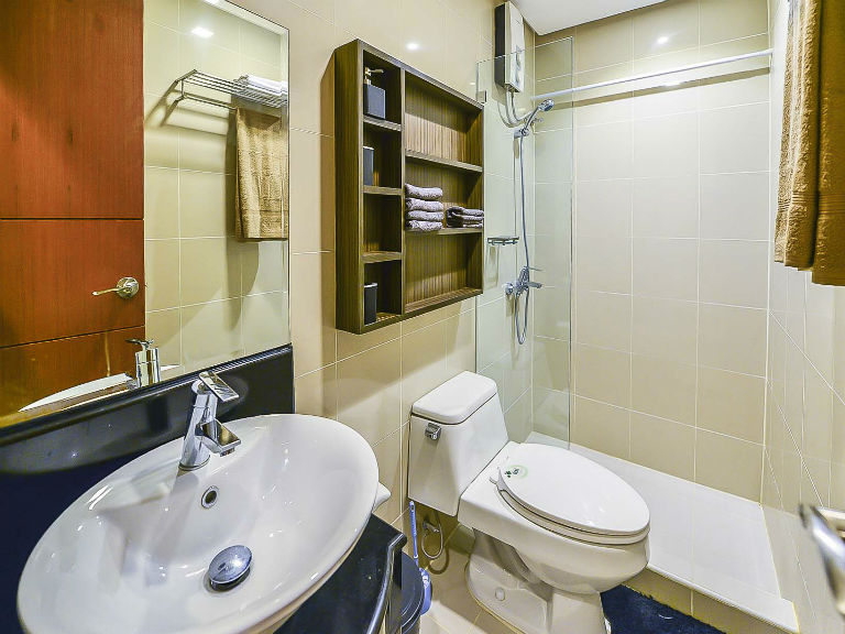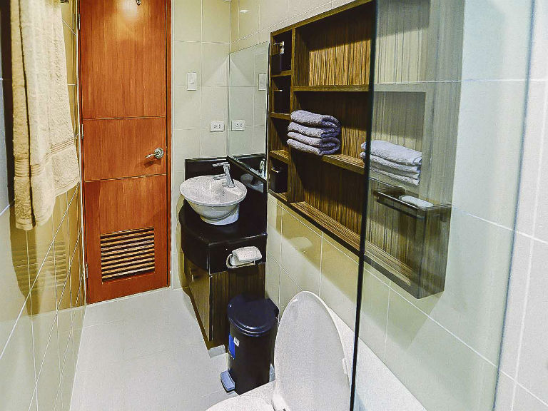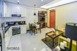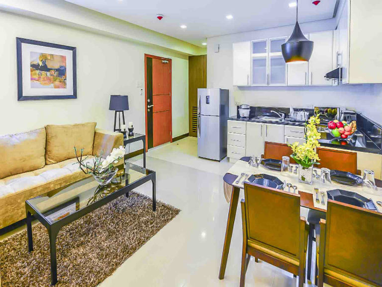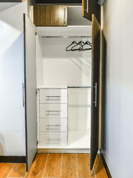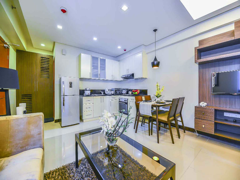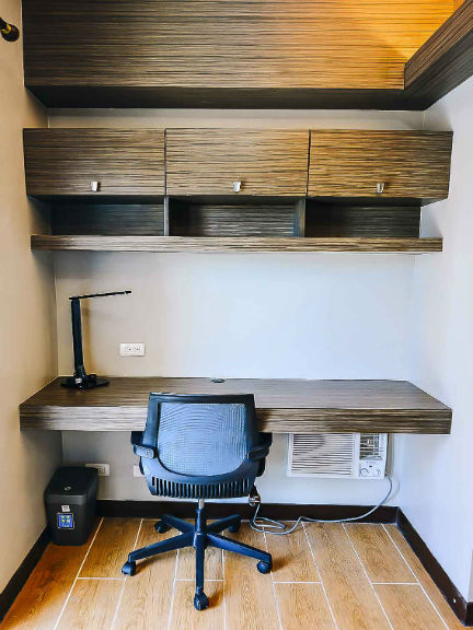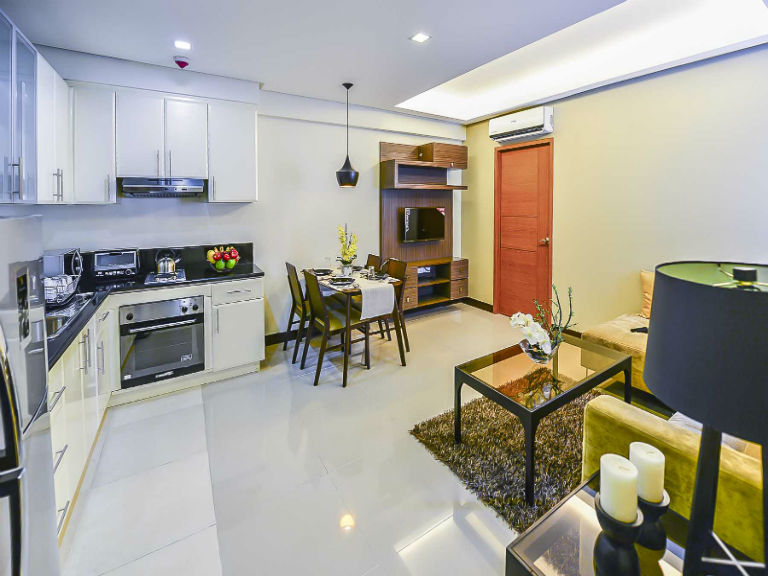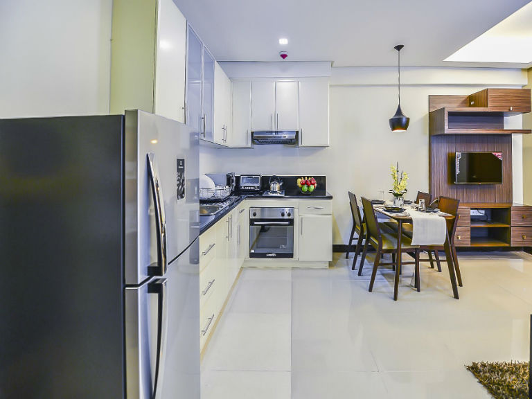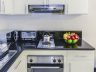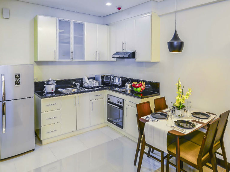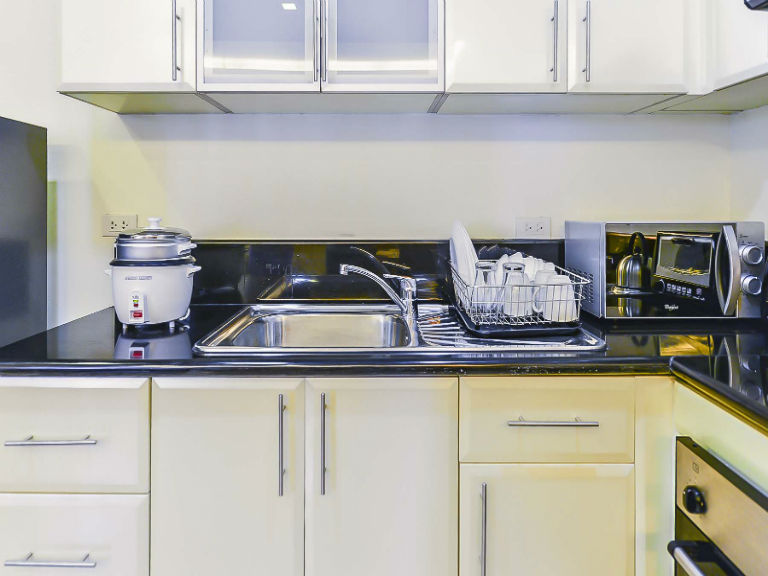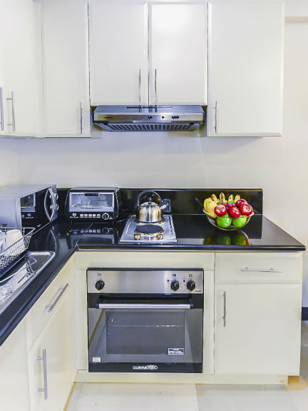 - L-shaped kitchenette complete with the essential cookware and a cream colored cupboard