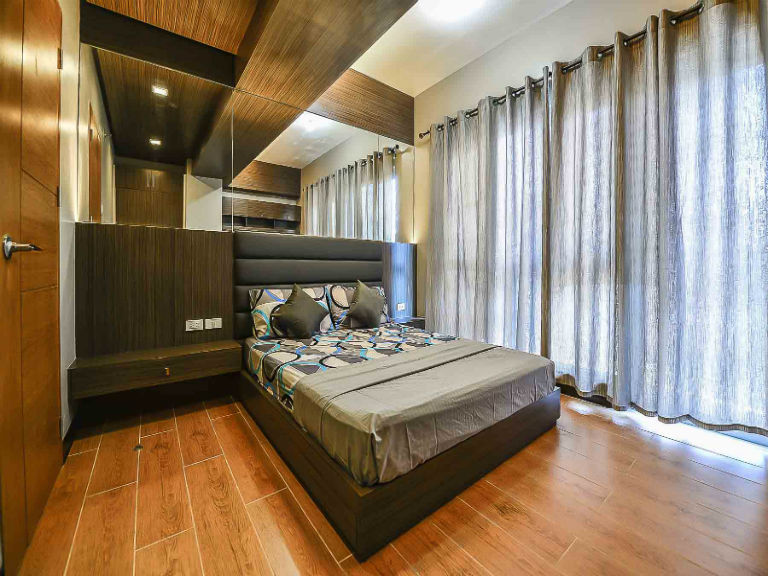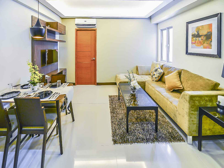 - A sectional sofa, a coffee table with a center flower and rug creates a tranquil feel