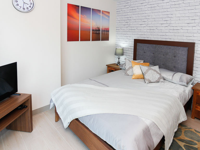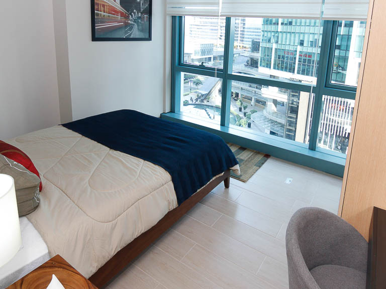 A full glass panel wall allows for natural daylight. Across the bed is a vinyl-coated wardrobe cabinet and a table-dresser with chair. At the opposite corner is the TV stand with the TV