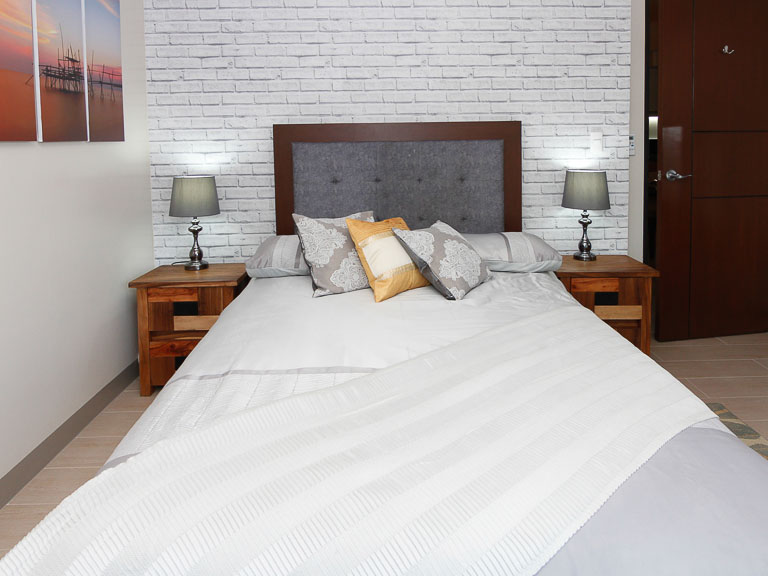 Bedroom one features a queen-sized bed with a wooden framed upholstered headboard against an accent headboard wall. Two accent side tables with lamps flank the bed
