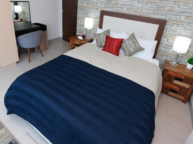 Bedroom two is similarly furnished and also lavished with natural lighting from the fall glass wall across the bed
