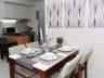 Pendant lights hover above the cozy four-sitter wooden dining set of beige upholstered chairs. Near the dining area is a breakfast bar with grey upholstered stools