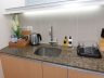 The corner kitchen with grey granite counters and beige cabinets is furnished with a two-door ref, a microwave and a four-burner electric range with a range hood. White and clear cupboards provide added storage space