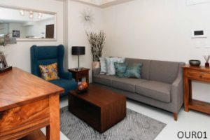 Wooden tables with decorative pieces in the living room are balanced with the fabric sofas and the grey area rug