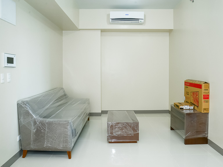 - The living room is furnished with a long fabric contemporary sofa, a rectangular wood center table and a media unit with a brand-new flat screen TV