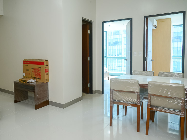 - The main door opens to a four-sitter dining table set just across the bedroom door and the door to the balcony